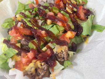 Tortilla Chips, Beef, Cheese, Lettuce, Tomato, Onion, BBQ sauce
